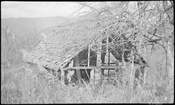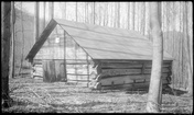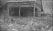 Wooden log cabin with twigs obstructing view, Jim Beard BarnGreat Smoky Mountains National ParkBuilding report photo.Jim Beard Barn; Indian Creek, Deep Creek; Building No. 149, II-B-(5)-3041, Physical Facilities - Buildings - Historic buildings being preserved