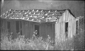 Close up detail of hinge, Roaring Fork truck trail barrier, building in background, 1937