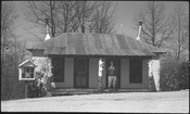 CCC camp supervisor standing in front of CCC building with two chimneys