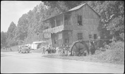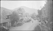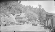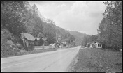 Craft shop and tourist cabin, Cherokee Indian ReservationGreat Smoky Mountains National ParkTourist cabin development and craft shops along NC Highway 107 in Cherokee Indian Reservation, 1 1/2 miles south of GSMNP... View taken looking towards Park.. Two-story building seen in distance on left of road is same as is een in preceding picture,Cherokee, North Carolina, IV-C-13534, Miscellaneous - Cherokee NC