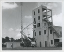 Snorkel truck at practice tower, October 8 1964 Everglades National Park; National Park Service Distant view of snorkel truck at practice tower; Fire Rescue Demonstration; "Aerial 13, a 50' hydraulically operated aerial platform (snorkel) and master stream appliance combined with 1,000 g.p.m. pumper with 400 gallon water tank carrying a minimum of 1,000 feet of 3" or an equivalent load of 2 1/2" hose." Photo Source: Metro Dade Public Saftey Division
