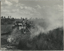 Two rangers on swamp buggy pulling pumper spraying water on grass fire Everglades National Park; National Park Service View of two rangers on swamp buggy pulling pumper spraying water on grass fire; "Rangers fight fire from Glades buggy" Locality: Photo Source: Keywords: Fire; Park Employees; Equipment.