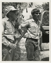 Two men standing by vehicleEverglades National Park; National Park ServiceClose up of two men by vehicle; man on left holding metal blade; "Near N. Key Largo croc. nest site. Dr. Craighead, R. Klukas."