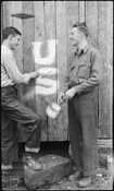 Equipment (canteens, lanterns, cans) marked U.S. N.P.S. C.C.C. on table, ...