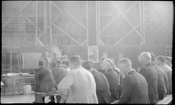 Men wearing dress shirts, ties, and suits inside building, possibly getting ...
