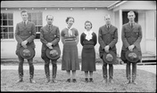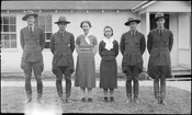Group portrait of ranger force and secretaries, views with hats on and hats off, group is standing in a line before a white clapboard building, from left to right Fred Binnewies, unidentified ranger, Ann Ewing, Maria Greer, Ivan Ellsworth, Bob Holland