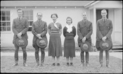 Group portrait of ranger force and secretaries, views with hats on and hats off, group is standing in a line before a white clapboard building, from left to right Robert P. Holland, Ann Ewing, Ivan Ellsworth, unidentified ranger, Maria Greer, Fred Binnewies