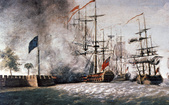 Painting by James Peale of Sir Peter Parker's attack on Fort Sullivan during Revolutionary War, South Carolina