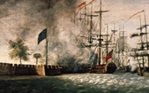 Painting by James Peale of Sir Peter Parker's attack on Fort Sullivan during Revolutionary War, South Carolina