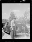 Mercury sedan rear with 1939 Hawaii plates, AAA of New York sticker, a Mammoth Cave, Kentucky bumper sticker, and a porter beside it