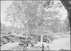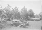 View of parking area showing numerous automobiles and trees