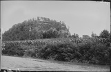 Looking up at large rock cliff, Buckeye Trail, 1958